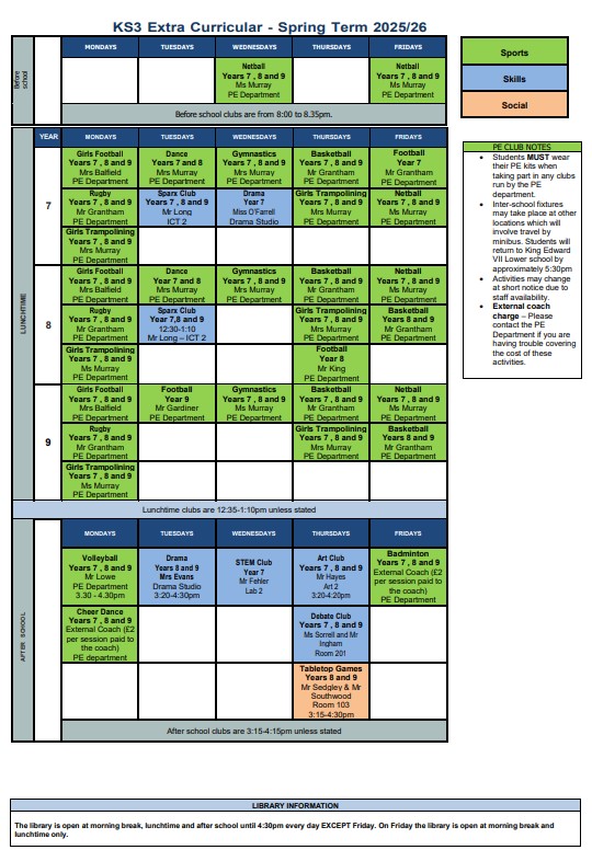 Activities may change at short notice due to staff availability, weather etc. External coach charge – please contact the PE department if you are having difficulty covering the cost of these activities.